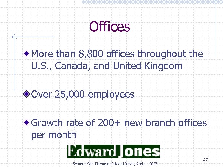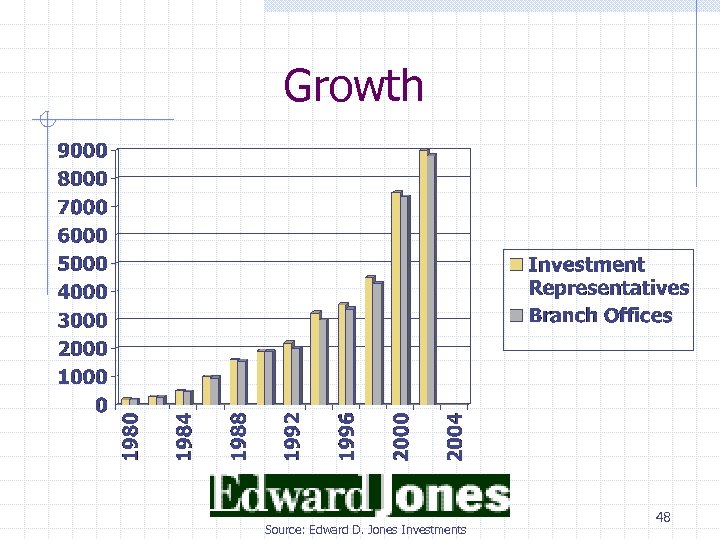 Offices More than 8, 800 offices throughout the U. S. , Canada, and United Kingdom Over 25, 000 employees Growth rate of 200+ new branch offices per month Source: Matt Eilerman, Edward Jones, April 1, 2003 47