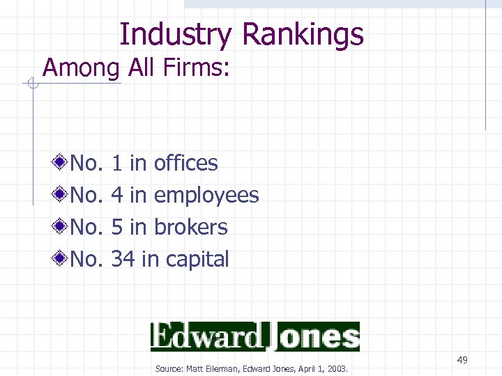 Industry Rankings Among All Firms: No. No. 1 in offices 4 in employees 5 in brokers 34 in capital Source: Matt Eilerman, Edward Jones, April 1, 2003. 49