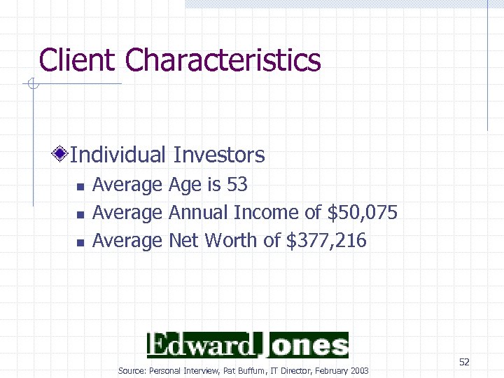 Client Characteristics Individual Investors n n n Average Age is 53 Average Annual Income of $50, 075 Average Net Worth of $377, 216 Source: Personal Interview, Pat Buffum, IT Director, February 2003 52