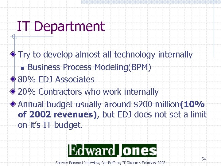 IT Department Try to develop almost all technology internally n Business Process Modeling(BPM) 80% EDJ Associates 20% Contractors who work internally Annual budget usually around $200 million(10% of 2002 revenues), but EDJ does not set a limit on it’s IT budget. Source: Personal Interview, Pat Buffum, IT Director, February 2003 54