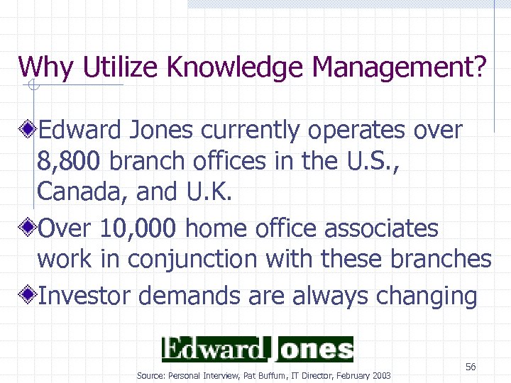 Why Utilize Knowledge Management? Edward Jones currently operates over 8, 800 branch offices in the U. S. , Canada, and U. K. Over 10, 000 home office associates work in conjunction with these branches Investor demands are always changing Source: Personal Interview, Pat Buffum, IT Director, February 2003 56