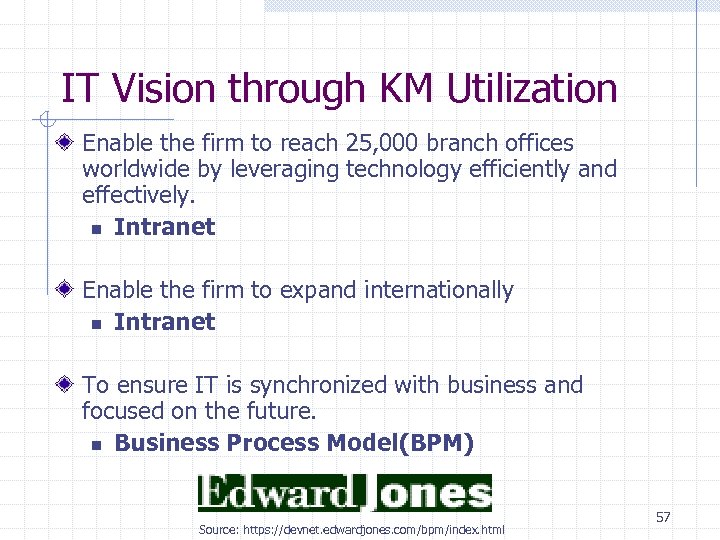IT Vision through KM Utilization Enable the firm to reach 25, 000 branch offices worldwide by leveraging technology efficiently and effectively. n Intranet Enable the firm to expand internationally n Intranet To ensure IT is synchronized with business and focused on the future. n Business Process Model(BPM) Source: https: //devnet. edwardjones. com/bpm/index. html 57