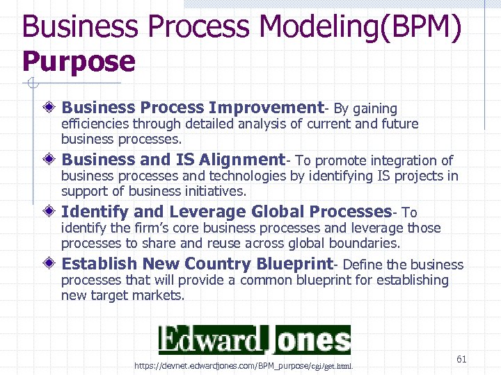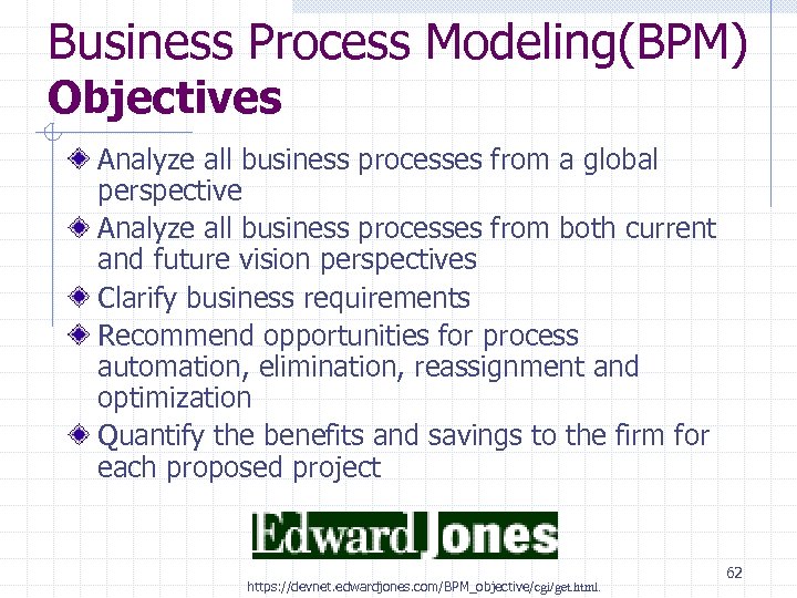 Business Process Modeling(BPM) Purpose Business Process Improvement- By gaining efficiencies through detailed analysis of current and future business processes. Business and IS Alignment- To promote integration of business processes and technologies by identifying IS projects in support of business initiatives. Identify and Leverage Global Processes- To identify the firm’s core business processes and leverage those processes to share and reuse across global boundaries. Establish New Country Blueprint- Define the business processes that will provide a common blueprint for establishing new target markets. https: //devnet. edwardjones. com/BPM_purpose/cgi/get. html. 61