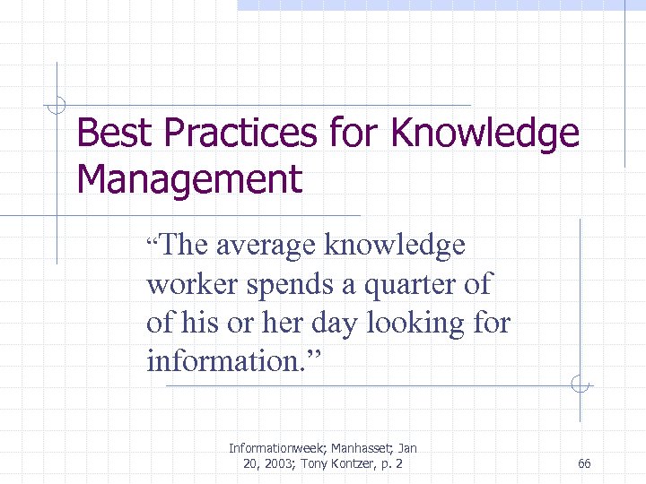 Best Practices for Knowledge Management “The average knowledge worker spends a quarter of of his or her day looking for information. ” Informationweek; Manhasset; Jan 20, 2003; Tony Kontzer, p. 2 66