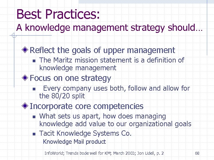 Best Practices: A knowledge management strategy should… Reflect the goals of upper management n The Maritz mission statement is a definition of knowledge management Focus on one strategy n Every company uses both, follow and allow for the 80/20 split Incorporate core competencies n n What sets us apart, how does managing knowledge add value to our organizational goals Tacit Knowledge Systems Co. Knowledge Mail product Info. World; Trends bode well for KM; March 2003; Jon Udell, p. 2 68