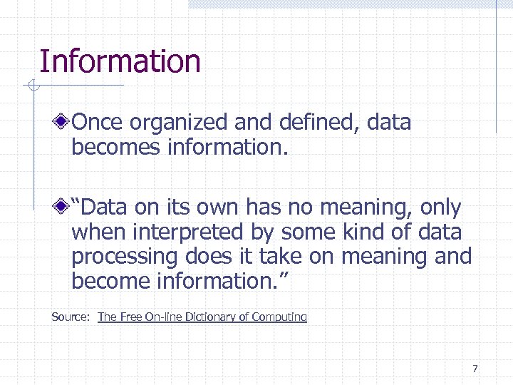 Data Raw data is the simplest and most abundant component of a knowledge management system “Data on its own has no meaning…” Source: The Free On-line Dictionary of Computing 6