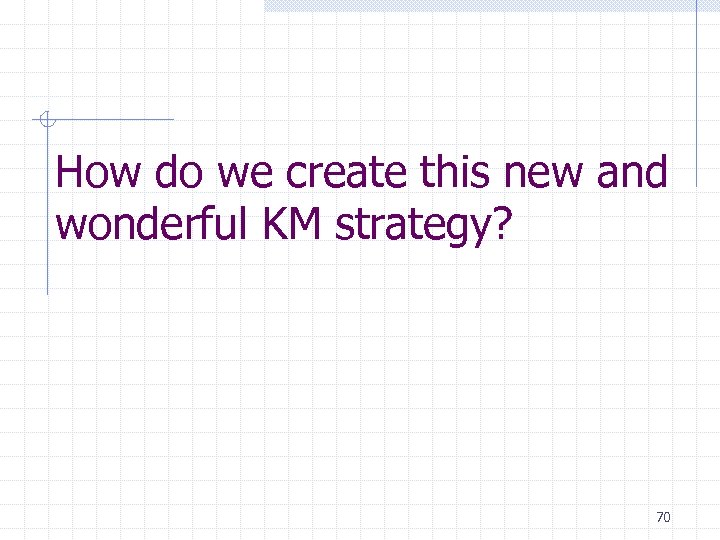 The 80/20 Split Tacit Heavy Organization n 80 % Tacit, 20% Explicit n Competitive advantage dictates strategy n Outsource explicit needs such as messaging and software customization Explicit Heavy Organization n 80% Explicit, 20% Tacit Competitive advantage dictates strategy Benefits by achieving economies of scale in knowledge through reuse 1. Harvard Business Review; Hansen 69