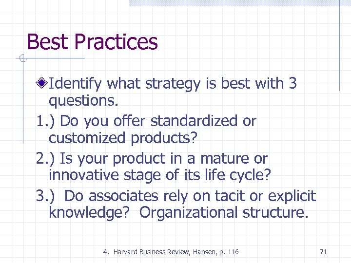 Best Practices Identify what strategy is best with 3 questions. 1. ) Do you offer standardized or customized products? 2. ) Is your product in a mature or innovative stage of its life cycle? 3. ) Do associates rely on tacit or explicit knowledge? Organizational structure. 4. Harvard Business Review, Hansen, p. 116 71
