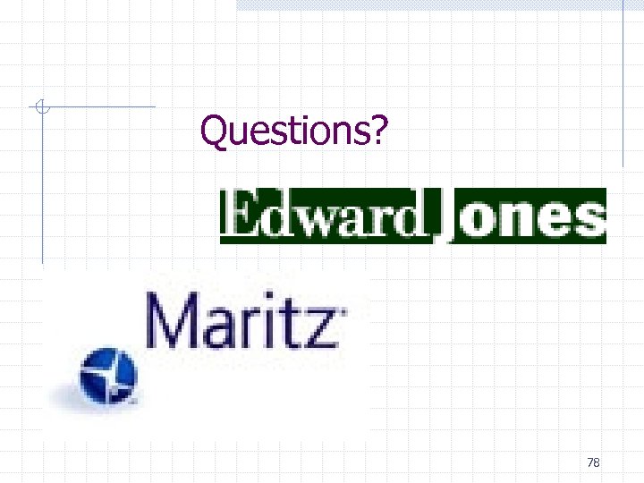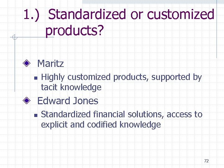 1. ) Standardized or customized products? Maritz n Highly customized products, supported by tacit knowledge Edward Jones n Standardized financial solutions, access to explicit and codified knowledge 72