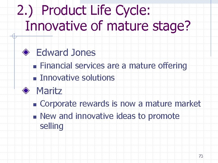 2. ) Product Life Cycle: Innovative of mature stage? Edward Jones n n Financial services are a mature offering Innovative solutions Maritz n n Corporate rewards is now a mature market New and innovative ideas to promote selling 73