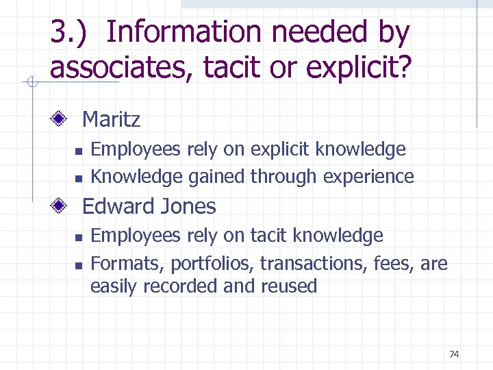 3. ) Information needed by associates, tacit or explicit? Maritz n n Employees rely on explicit knowledge Knowledge gained through experience Edward Jones n n Employees rely on tacit knowledge Formats, portfolios, transactions, fees, are easily recorded and reused 74