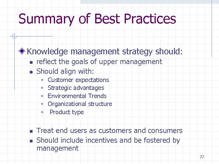 Summary of Best Practices Knowledge management strategy should: n n reflect the goals of upper management Should align with: w w w n n Customer expectations Strategic advantages Environmental Trends Organizational structure Product type Treat end users as customers and consumers Should include incentives and be fostered by management 77
