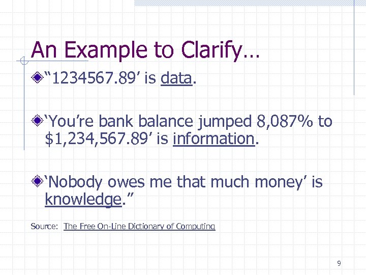 An Example to Clarify… “ 1234567. 89’ is data. ‘You’re bank balance jumped 8, 087% to $1, 234, 567. 89’ is information. ‘Nobody owes me that much money’ is knowledge. ” Source: The Free On-Line Dictionary of Computing 9