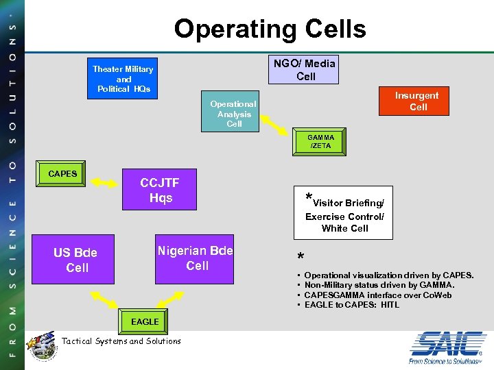Operating Cells NGO/ Media Cell Theater Military and Political HQs Insurgent Cell Operational Analysis Cell GAMMA /ZETA CAPES CCJTF Hqs *Visitor Briefing/ Exercise Control/ White Cell US Bde Cell Nigerian Bde Cell EAGLE Tactical Systems and Solutions * • Operational visualization driven by CAPES. • Non-Military status driven by GAMMA. • CAPESGAMMA interface over Co. Web • EAGLE to CAPES: HITL