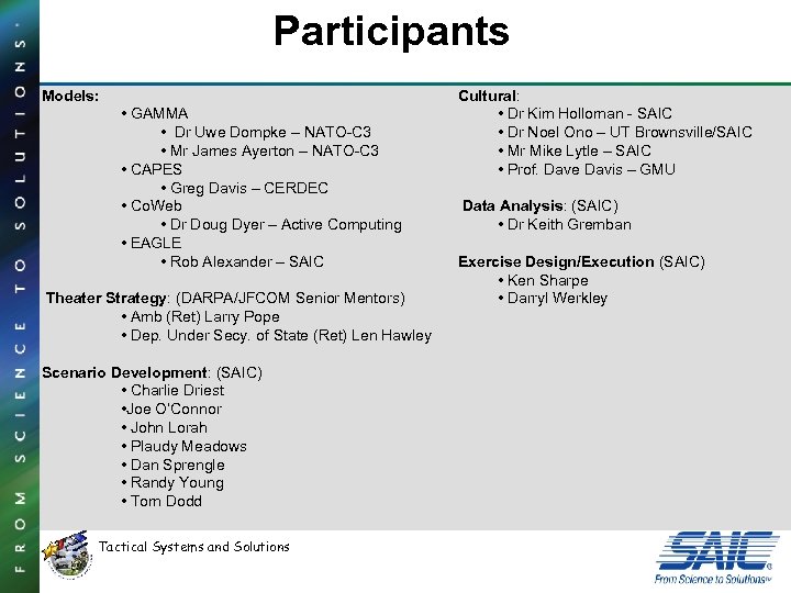 Participants Models: • GAMMA • Dr Uwe Dompke – NATO-C 3 • Mr James Ayerton – NATO-C 3 • CAPES • Greg Davis – CERDEC • Co. Web • Dr Doug Dyer – Active Computing • EAGLE • Rob Alexander – SAIC Theater Strategy: (DARPA/JFCOM Senior Mentors) • Amb (Ret) Larry Pope • Dep. Under Secy. of State (Ret) Len Hawley Scenario Development: (SAIC) • Charlie Driest • Joe O’Connor • John Lorah • Plaudy Meadows • Dan Sprengle • Randy Young • Tom Dodd Tactical Systems and Solutions Cultural: • Dr Kim Holloman - SAIC • Dr Noel Ono – UT Brownsville/SAIC • Mr Mike Lytle – SAIC • Prof. Dave Davis – GMU Data Analysis: (SAIC) • Dr Keith Gremban Exercise Design/Execution (SAIC) • Ken Sharpe • Darryl Werkley
