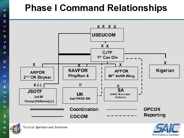 Phase I Command Relationships X X USEUCOM X X CJTF 1 st Cav Div X ARFOR nd CR Stryker 2 X (-) JSOTF 3 rd SF Group (Airborne) (-) X NAVFOR Phip. Ron 4 II UK 2 nd PARA BN Coordination COCOM Tactical Systems and Solutions X AFFOR X Nigerian 86 th Airlift Wing II SA 2/44 th Motorized Battalion OPCON Reporting
