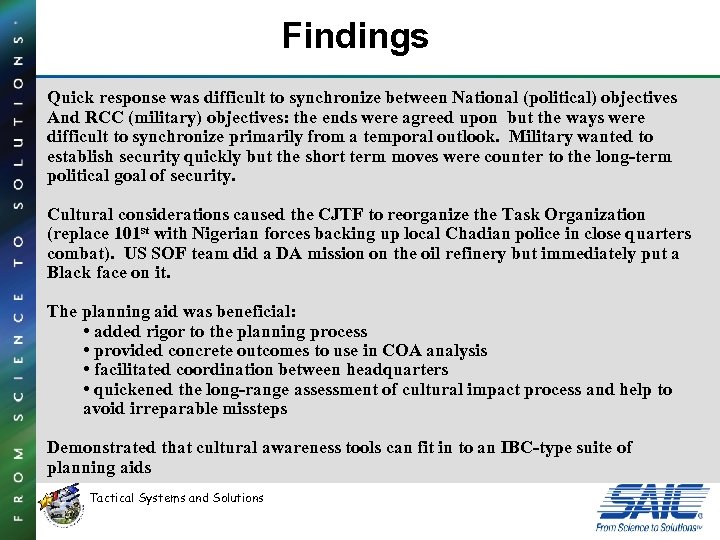 Findings Quick response was difficult to synchronize between National (political) objectives And RCC (military) objectives: the ends were agreed upon but the ways were difficult to synchronize primarily from a temporal outlook. Military wanted to establish security quickly but the short term moves were counter to the long-term political goal of security. Cultural considerations caused the CJTF to reorganize the Task Organization (replace 101 st with Nigerian forces backing up local Chadian police in close quarters combat). US SOF team did a DA mission on the oil refinery but immediately put a Black face on it. The planning aid was beneficial: • added rigor to the planning process • provided concrete outcomes to use in COA analysis • facilitated coordination between headquarters • quickened the long-range assessment of cultural impact process and help to avoid irreparable missteps Demonstrated that cultural awareness tools can fit in to an IBC-type suite of planning aids Tactical Systems and Solutions