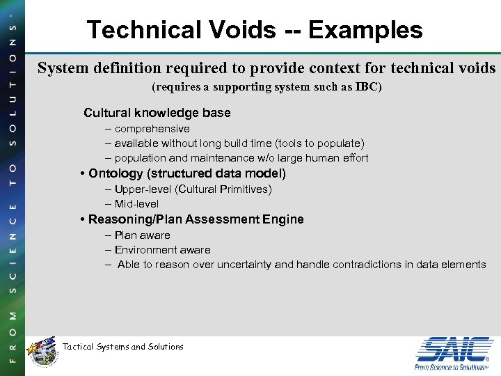 Technical Voids -- Examples System definition required to provide context for technical voids (requires a supporting system such as IBC) Cultural knowledge base – comprehensive – available without long build time (tools to populate) – population and maintenance w/o large human effort • Ontology (structured data model) – Upper-level (Cultural Primitives) – Mid-level • Reasoning/Plan Assessment Engine – Plan aware – Environment aware – Able to reason over uncertainty and handle contradictions in data elements Tactical Systems and Solutions