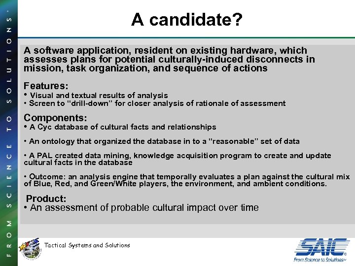 A candidate? A software application, resident on existing hardware, which assesses plans for potential culturally-induced disconnects in mission, task organization, and sequence of actions Features: • Visual and textual results of analysis • Screen to “drill-down” for closer analysis of rationale of assessment Components: • A Cyc database of cultural facts and relationships • An ontology that organized the database in to a “reasonable” set of data • A PAL created data mining, knowledge acquisition program to create and update cultural facts in the database • Outcome: an analysis engine that temporally evaluates a plan against the cultural mix of Blue, Red, and Green/White players, the environment, and ambient conditions. Product: • An assessment of probable cultural impact over time Tactical Systems and Solutions