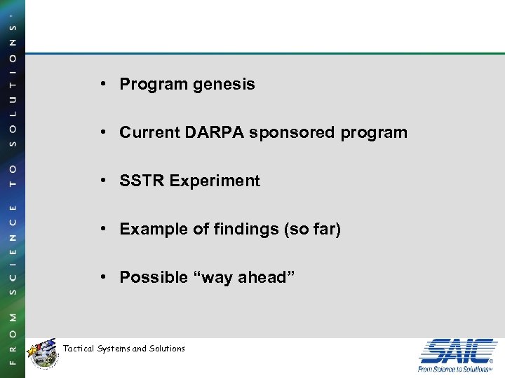 • Program genesis • Current DARPA sponsored program • SSTR Experiment • Example of findings (so far) • Possible “way ahead” Tactical Systems and Solutions