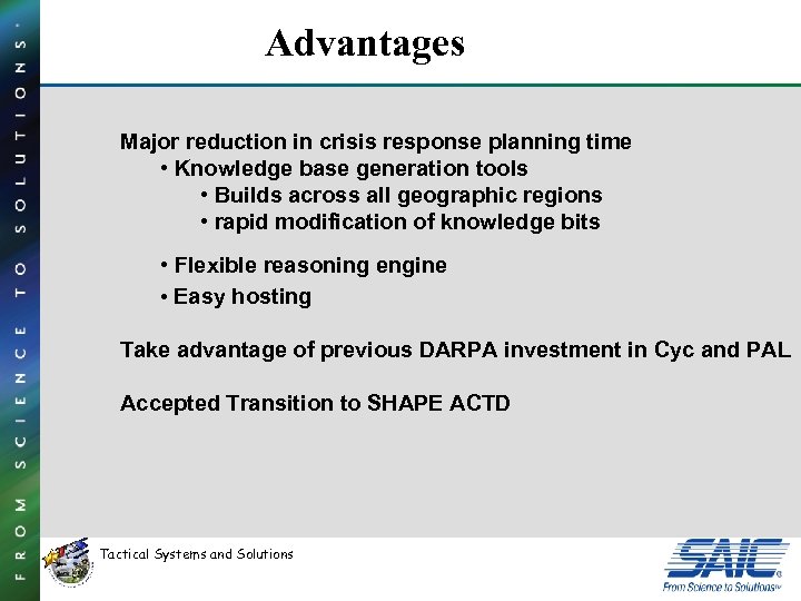Advantages Major reduction in crisis response planning time • Knowledge base generation tools • Builds across all geographic regions • rapid modification of knowledge bits • Flexible reasoning engine • Easy hosting Take advantage of previous DARPA investment in Cyc and PAL Accepted Transition to SHAPE ACTD Tactical Systems and Solutions