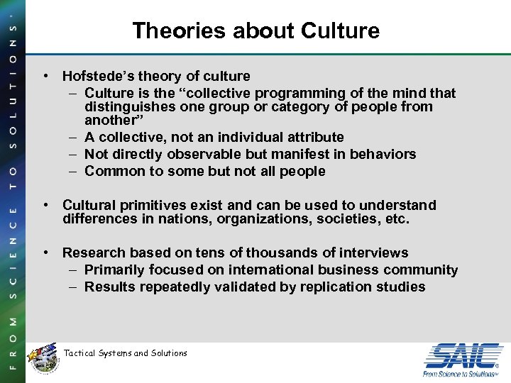 Theories about Culture • Hofstede’s theory of culture – Culture is the “collective programming of the mind that distinguishes one group or category of people from another” – A collective, not an individual attribute – Not directly observable but manifest in behaviors – Common to some but not all people • Cultural primitives exist and can be used to understand differences in nations, organizations, societies, etc. • Research based on tens of thousands of interviews – Primarily focused on international business community – Results repeatedly validated by replication studies Tactical Systems and Solutions