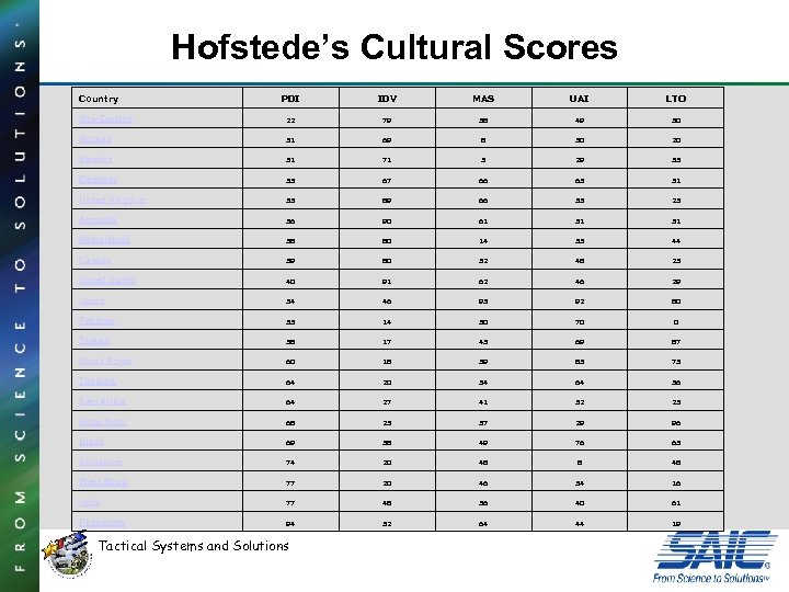Hofstede’s Cultural Scores Country PDI IDV MAS UAI LTO New Zealand 22 79 58 49 30 Norway 31 69 8 50 20 Sweden 31 71 5 29 33 Germany 35 67 66 65 31 United Kingdom 35 89 66 35 25 Australia 36 90 61 51 31 Netherlands 38 80 14 53 44 Canada 39 80 52 48 23 United States 40 91 62 46 29 Japan 54 46 95 92 80 Pakistan 55 14 50 70 0 Taiwan 58 17 45 69 87 South Korea 60 18 39 85 75 Thailand 64 20 34 64 56 East Africa 64 27 41 52 25 Hong Kong 68 25 57 29 96 Brazil 69 38 49 76 65 Singapore 74 20 48 8 48 West Africa 77 20 46 54 16 India 77 48 56 40 61 Philippines 94 32 64 44 19 Tactical Systems and Solutions
