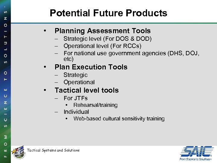 Potential Future Products • Planning Assessment Tools – Strategic level (For DOS & DOD) – Operational level (For RCCs) – For national use government agencies (DHS, DOJ, etc) • Plan Execution Tools – Strategic – Operational • Tactical level tools – For JTFs • Rehearsal/training – Individual • Web-based cultural sensitivity training Tactical Systems and Solutions