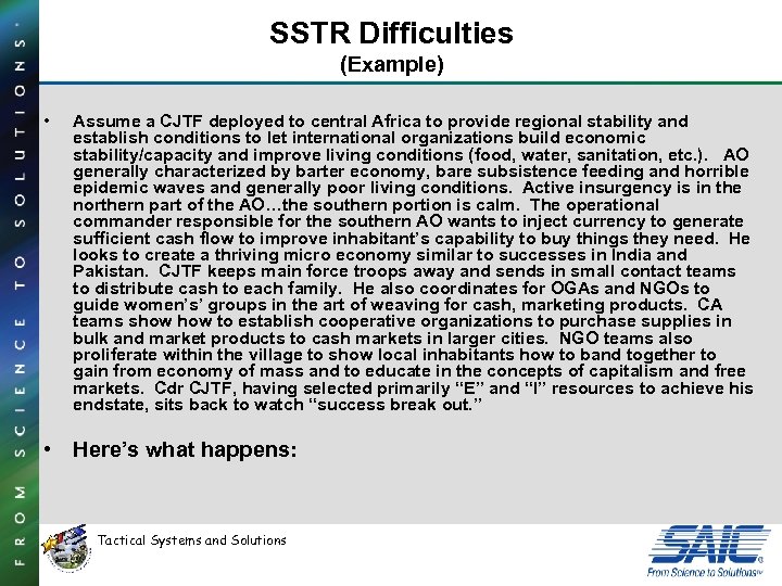 SSTR Difficulties (Example) • Assume a CJTF deployed to central Africa to provide regional stability and establish conditions to let international organizations build economic stability/capacity and improve living conditions (food, water, sanitation, etc. ). AO generally characterized by barter economy, bare subsistence feeding and horrible epidemic waves and generally poor living conditions. Active insurgency is in the northern part of the AO…the southern portion is calm. The operational commander responsible for the southern AO wants to inject currency to generate sufficient cash flow to improve inhabitant’s capability to buy things they need. He looks to create a thriving micro economy similar to successes in India and Pakistan. CJTF keeps main force troops away and sends in small contact teams to distribute cash to each family. He also coordinates for OGAs and NGOs to guide women’s’ groups in the art of weaving for cash, marketing products. CA teams show to establish cooperative organizations to purchase supplies in bulk and market products to cash markets in larger cities. NGO teams also proliferate within the village to show local inhabitants how to band together to gain from economy of mass and to educate in the concepts of capitalism and free markets. Cdr CJTF, having selected primarily “E” and “I” resources to achieve his endstate, sits back to watch “success break out. ” • Here’s what happens: Tactical Systems and Solutions