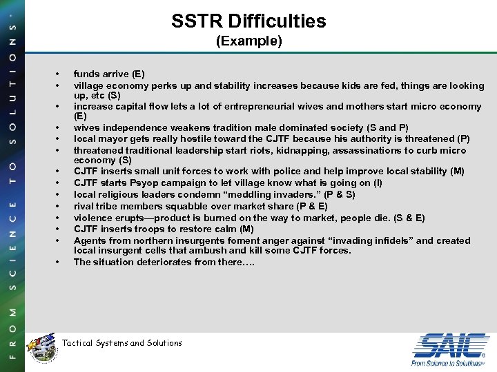 SSTR Difficulties (Example) • • • • funds arrive (E) village economy perks up and stability increases because kids are fed, things are looking up, etc (S) increase capital flow lets a lot of entrepreneurial wives and mothers start micro economy (E) wives independence weakens tradition male dominated society (S and P) local mayor gets really hostile toward the CJTF because his authority is threatened (P) threatened traditional leadership start riots, kidnapping, assassinations to curb micro economy (S) CJTF inserts small unit forces to work with police and help improve local stability (M) CJTF starts Psyop campaign to let village know what is going on (I) local religious leaders condemn “meddling invaders. ” (P & S) rival tribe members squabble over market share (P & E) violence erupts—product is burned on the way to market, people die. (S & E) CJTF inserts troops to restore calm (M) Agents from northern insurgents foment anger against “invading infidels” and created local insurgent cells that ambush and kill some CJTF forces. The situation deteriorates from there…. Tactical Systems and Solutions