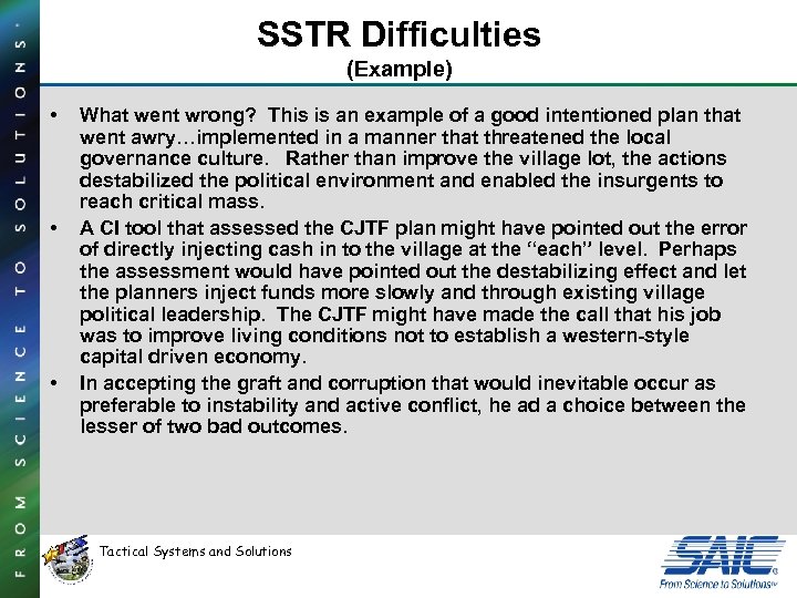 SSTR Difficulties (Example) • • • What went wrong? This is an example of a good intentioned plan that went awry…implemented in a manner that threatened the local governance culture. Rather than improve the village lot, the actions destabilized the political environment and enabled the insurgents to reach critical mass. A CI tool that assessed the CJTF plan might have pointed out the error of directly injecting cash in to the village at the “each” level. Perhaps the assessment would have pointed out the destabilizing effect and let the planners inject funds more slowly and through existing village political leadership. The CJTF might have made the call that his job was to improve living conditions not to establish a western-style capital driven economy. In accepting the graft and corruption that would inevitable occur as preferable to instability and active conflict, he ad a choice between the lesser of two bad outcomes. Tactical Systems and Solutions