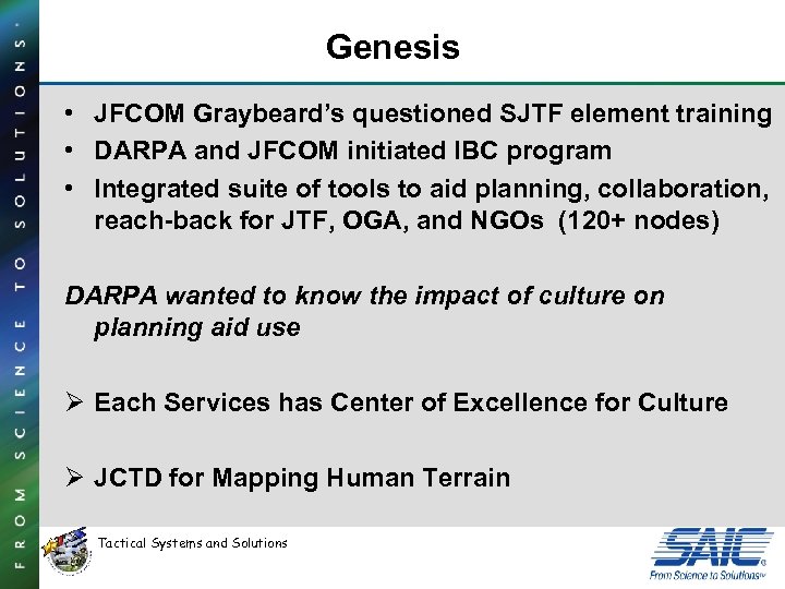 Genesis • JFCOM Graybeard’s questioned SJTF element training • DARPA and JFCOM initiated IBC program • Integrated suite of tools to aid planning, collaboration, reach-back for JTF, OGA, and NGOs (120+ nodes) DARPA wanted to know the impact of culture on planning aid use Ø Each Services has Center of Excellence for Culture Ø JCTD for Mapping Human Terrain Tactical Systems and Solutions