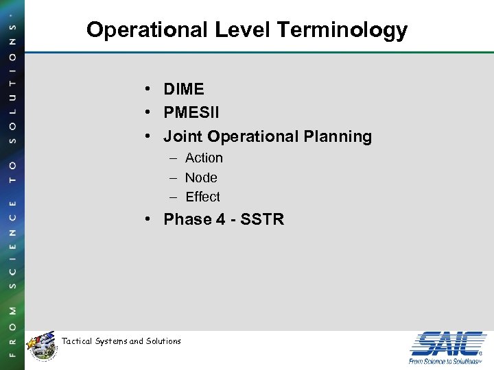 Operational Level Terminology • DIME • PMESII • Joint Operational Planning – Action – Node – Effect • Phase 4 - SSTR Tactical Systems and Solutions