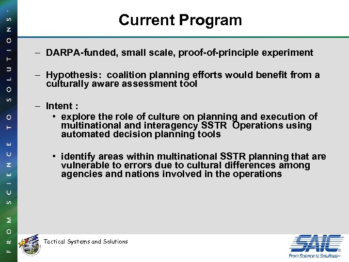 Current Program – DARPA-funded, small scale, proof-of-principle experiment – Hypothesis: coalition planning efforts would benefit from a culturally aware assessment tool – Intent : • explore the role of culture on planning and execution of multinational and interagency SSTR Operations using automated decision planning tools • identify areas within multinational SSTR planning that are vulnerable to errors due to cultural differences among agencies and nations involved in the operations Tactical Systems and Solutions