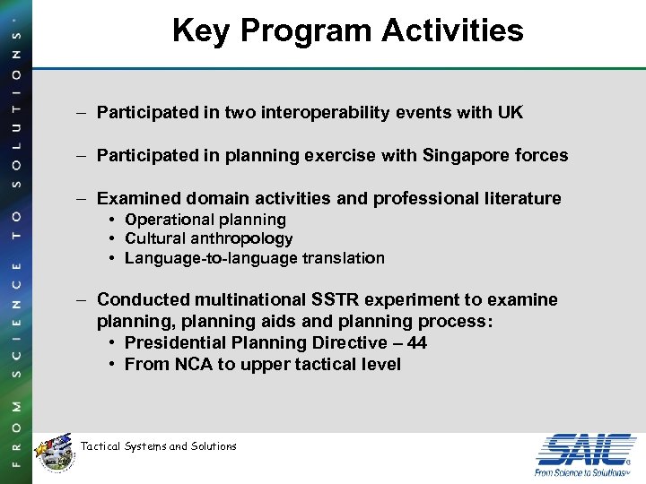 Key Program Activities – Participated in two interoperability events with UK – Participated in planning exercise with Singapore forces – Examined domain activities and professional literature • Operational planning • Cultural anthropology • Language-to-language translation – Conducted multinational SSTR experiment to examine planning, planning aids and planning process: • Presidential Planning Directive – 44 • From NCA to upper tactical level Tactical Systems and Solutions