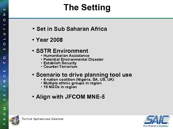 The Setting • Set in Sub Saharan Africa • Year 2008 • SSTR Environment • Humanitarian Assistance • Potential Environmental Disaster • Establish Security • Counter-Terrorism • Scenario to drive planning tool use • 4 nation coalition (Nigeria, SA, US, UK) • Multiple ethnic groups in region • 18 NGOs in region • Align with JFCOM MNE-5 Tactical Systems and Solutions
