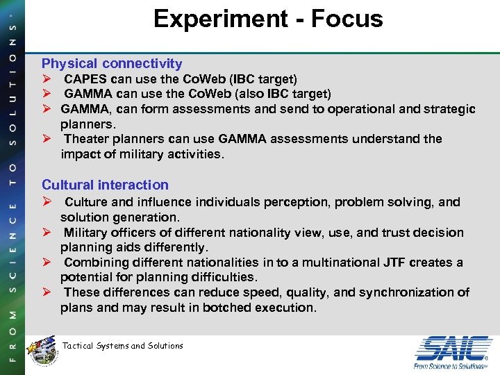 Experiment - Focus Physical connectivity Ø CAPES can use the Co. Web (IBC target) Ø GAMMA can use the Co. Web (also IBC target) Ø GAMMA, can form assessments and send to operational and strategic planners. Ø Theater planners can use GAMMA assessments understand the impact of military activities. Cultural interaction Ø Culture and influence individuals perception, problem solving, and solution generation. Ø Military officers of different nationality view, use, and trust decision planning aids differently. Ø Combining different nationalities in to a multinational JTF creates a potential for planning difficulties. Ø These differences can reduce speed, quality, and synchronization of plans and may result in botched execution. Tactical Systems and Solutions