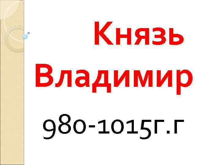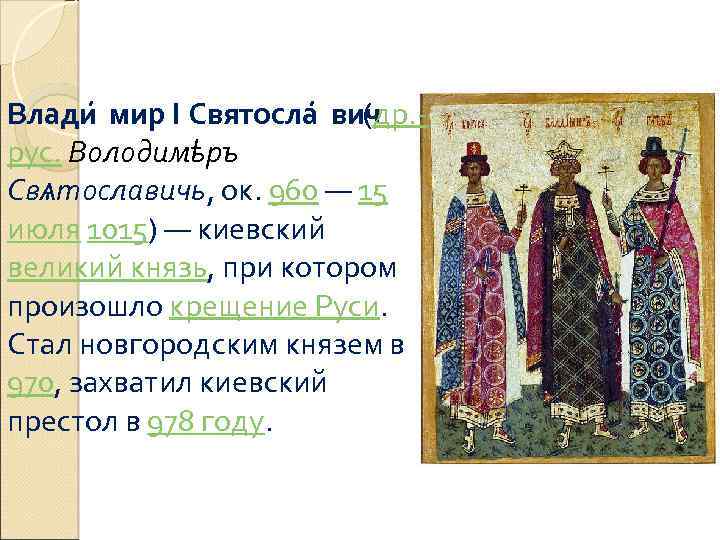 Влади мир I Святосла вич (др. рус. Володимѣръ Свѧтославичь, ок. 960 — 15 июля 1015) — киевский великий князь, при котором произошло крещение Руси. Стал новгородским князем в 970, захватил киевский престол в 978 году.