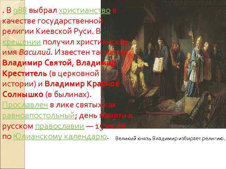 . В 988 выбрал христианство в качестве государственной религии Киевской Руси. В крещении получил христианское имя Василий. Известен также как Владимир Святой, Владимир Креститель (в церковной истории) и Владимир Красное Солнышко (в былинах). Прославлен в лике святых как равноапостольный; день памяти в русском православии — 15 июля по Юлианскому календарю. Великий князь Владимир избирает религию.