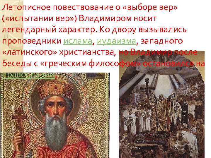 Летописное повествование о «выборе вер» ( «испытании вер» ) Владимиром носит легендарный характер. Ко двору вызывались проповедники ислама, иудаизма, западного «латинского» христианства, но Владимир после беседы с «греческим философом» остановился на православии.
