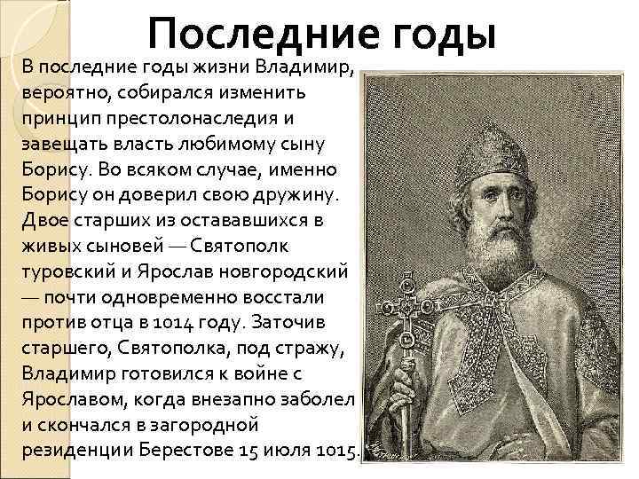 Последние годы В последние годы жизни Владимир, вероятно, собирался изменить принцип престолонаследия и завещать власть любимому сыну Борису. Во всяком случае, именно Борису он доверил свою дружину. Двое старших из остававшихся в живых сыновей — Святополк туровский и Ярослав новгородский — почти одновременно восстали против отца в 1014 году. Заточив старшего, Святополка, под стражу, Владимир готовился к войне с Ярославом, когда внезапно заболел и скончался в загородной резиденции Берестове 15 июля 1015.