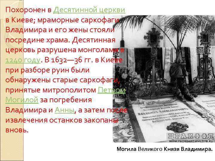 Похоронен в Десятинной церкви в Киеве; мраморные саркофаги Владимира и его жены стояли посредине храма. Десятинная церковь разрушена монголами в 1240 году. В 1632— 36 гг. в Киеве при разборе руин были обнаружены старые саркофаги, принятые митрополитом Петром Могилой за погребения Владимира и Анны, а затем после извлечения останков закопаны вновь. Могила Великого Князя Владимира.