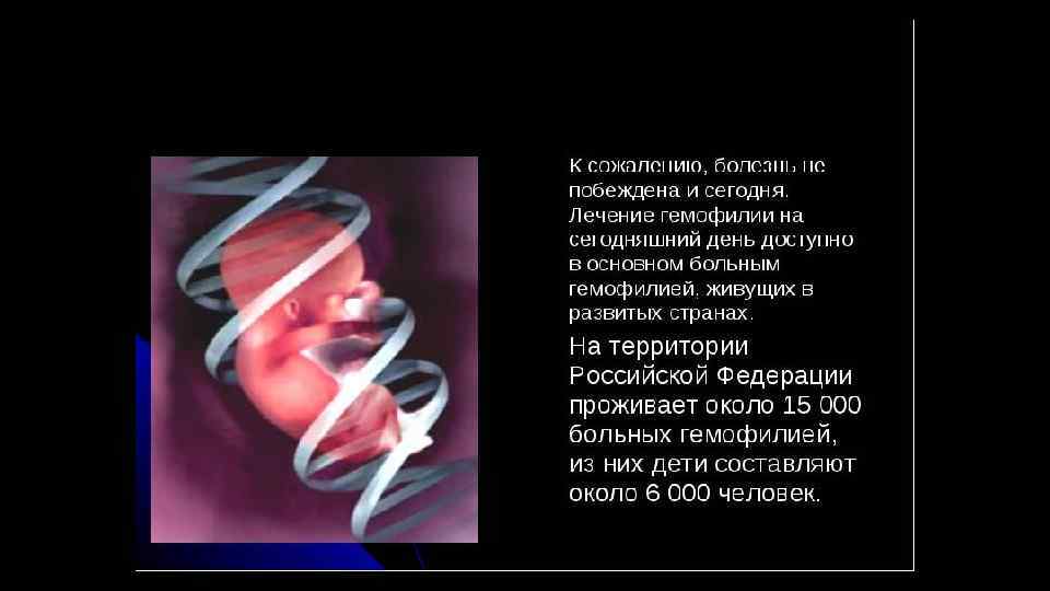Гемофилия – это сцепленное с Х-хромосомой врожденное нарушение свёртываемости крови, вызванное недостаточностью или отсутствием фактора свертывания крови VIII (гемофилия А), фактора IX (гемофилия В) или фактора XI (гемофилия С)