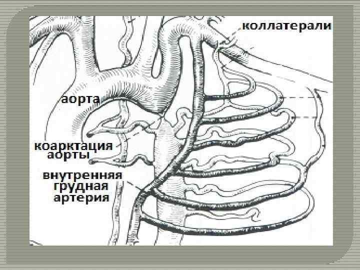 Еще в период внутриутробной жизни у больных с коарктацией аорты развивается большая сеть коллатеральных сосудов, выраженность которой зависит от характера сужения аорты. Сосуды, участвующие в коллатеральном кровообращении (ветви подключичной артерии, межреберные, внутренние грудные, лопаточные артерии, артерии эпигастрия), со временем значительно увеличиваются в диаметре, стенки их истончаются. Возникают аневризмы аорты, коллатеральных артерий, сосудов головного мозга. Особенно часто эти изменения наблюдаются у больных старше 20 лет. У больных старше 8 - 10 лет расширенные межреберные артерии могут вызвать деформацию нижних краев ребер, так называемые узуры.