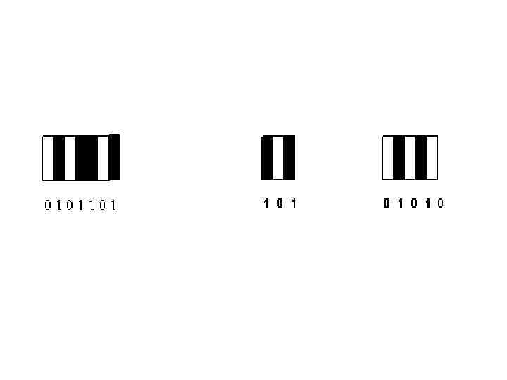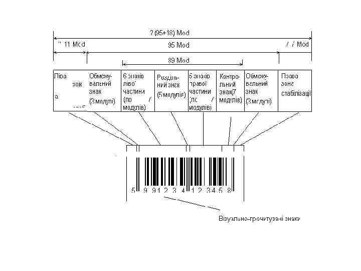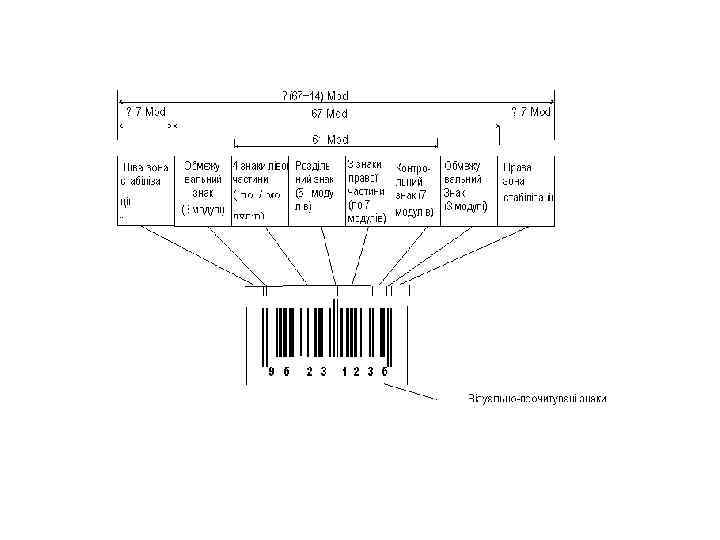 • Знаки ШК — це послідовність штрихів та проміжків. • Кожний інформаційний знак складається з двох штрихів та двох проміжків загальною шириною 7 модулів. • Один штрих або один проміжок може містити від одного до чотирьох модулів. Кожному модулю відповідає двійкове значення « 0» або « 1» . Одному модулю проміжка відповідає « 0» , одному модулю штриха — « 1» , а інформаційному знаку ШК відповідає семизначний двійковий код.