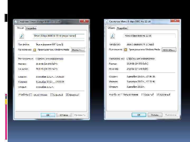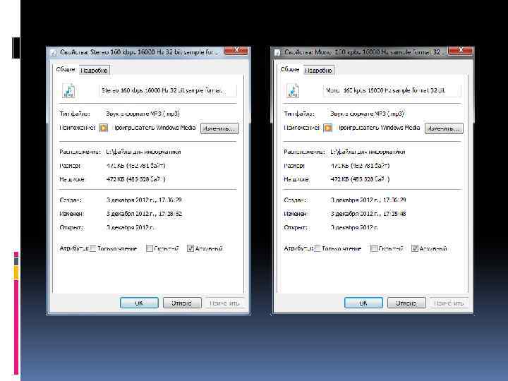Качество оцифрованного звука Чем больше глубина и частота дискретизации звука, тем более качественным будет звучание звука. Stereo 8 kbps 8000 Hz 32 bit Мono 8 kbps 8000 Hz 32 bit Stereo 160 kbps 16000 Hz 32 bit Mono 160 kbps 16000 Hz 32 bit Stereo 320 kbps 48000 Hz 32 bit Mono 320 kbps 48000 Hz 32 bit