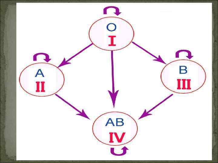 Первую группу (0) определяют рецессивные гены i 0, вторую группу (А) определяет доминантный аллель IA, третью группу (В) определяет доминантный аллель IB, а четвертую (АВ) – два доминантных аллеля IAIB.