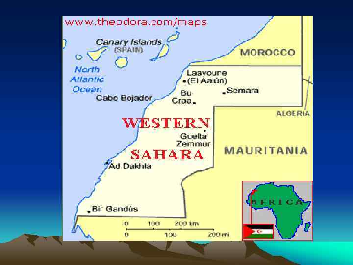 Міжнародний (зовнішньополітичний) конфлікт – цілком конкретний міжнародно-політичний процес, який має певне походження, зміст і форму, систему, структуру і фази розвитку. У міжнародних конфліктах основними суб'єктами переважно є держави. • Західна Сахара має вигідне географічне положення, оскільки вона витягнута вздовж Атлантичного узбережжя. • Також найбільше у світі родовище високоякісних фосфоритів Бу-Краа (відкрите в 1963 р. , близько 1/4 світових запасів)