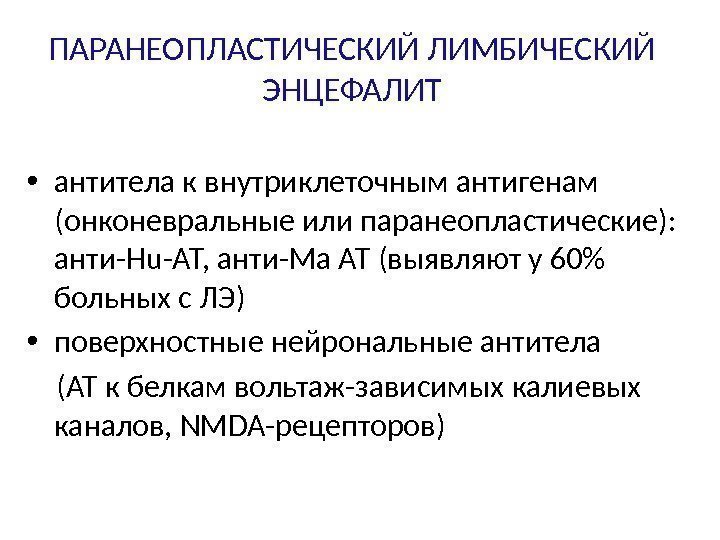 ПАРАНЕОПЛАСТИЧЕСКИЙ ЛИМБИЧЕСКИЙ ЭНЦЕФАЛИТ • антитела к внутриклеточным антигенам (онконевральные или паранеопластические): анти-Hu-АТ, анти-Ма АТ (выявляют у 60% больных с ЛЭ) • поверхностные нейрональные антитела (АТ к белкам вольтаж-зависимых калиевых каналов, NMDA-рецепторов)