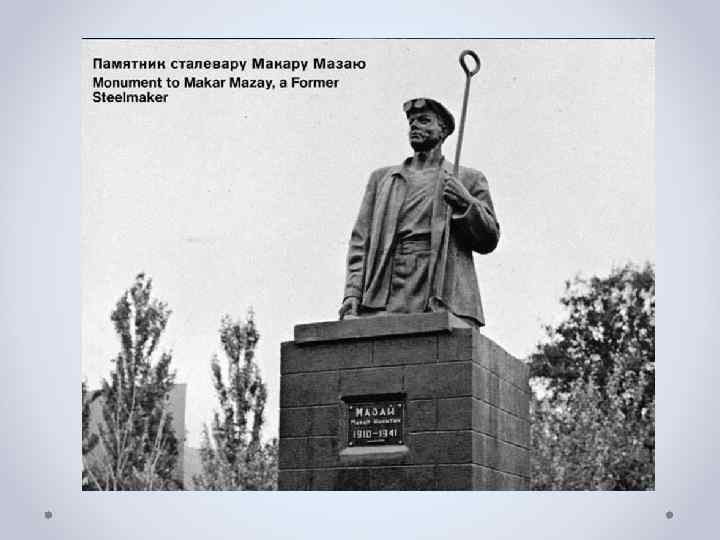 Макар Мазай Сталевар Мариупольского металлургического завода имени Ильича. В 1936 г. — один из зачинателей движения скоростного сталеварения. В октябре 1936 г. Макар Мазай один за другим устанавливает рекорды по съёму стали с квадратного метра пода печи с максимальным результатом 15 тонн за 6 часов 30 минут. В годы Великой Отечественной войны Макар Мазай не успел эвакуироваться и остался в оккупированном Мариуполе. Был схвачен и расстрелян после длительных жестоких пыток и истязаний за отказ сотрудничать с немцами.